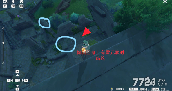 第一幅图两个继电石要卡极限距离,而且容易被上面的雷灵干扰,第二幅图继电石要放在倒塌的石板上,然后你自己站在我标的点上,需要沾染雷元素或者去第一幅图左下角的雷樱树拿雷种子(不过容易干扰到继电石路线,建议自己沾染雷元素去连接)